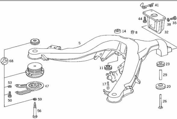Da ich keine Grube zur Verfügung hatte bin ich mit dem Wagen auf Auffahrrampen gefahren. So hatte ich genug Platz unter dem Auto um den Hinterachsträger abzusenken. Dann habe ich den Hinterachsträger mit einem hydraulischen Wagenheber unterstützt, die Gummiaufhängung des Auspuffs abgebaut, die zwei Schrauben (50) des Abstützblechs (47) und die Schraube (56) des Lagers rausgedreht (Den Austausch der Lager links und rechts nacheinander ausführen). Danach habe ich den Hinterachsträger mit dem hydraulischen Wagenheber so weit abgesenkt, bis ich das Ausdrückwerkzeug ansetzen konnte. Jetzt das alte Lager mit dem Ausdrückwerkzeug auf Spannung gebracht und von aussen mit einigen heftigen Schlägen das Lager überredet rauszukommen. Die Aufnahme des Lagers gereinigt, das neue Lager mit Silikonspray eingesprüht und mit den "Nieren" in Fahrtrichtung von hand in die Lageraufnahme gedrückt. Nun den Hinterachsträger mit dem hydraul. Wagenheber angehoben, das Abstützblech (47) mit den Schrauben (56) montiert,die Lagerschraube (56) montiert, die Gummiaufhängung des Auspuffs angebaut, fertig war die erste Seite. Dauer ca. 2 Stunden. Danach die zweite Seite mit Übung: ca. 45 min.
