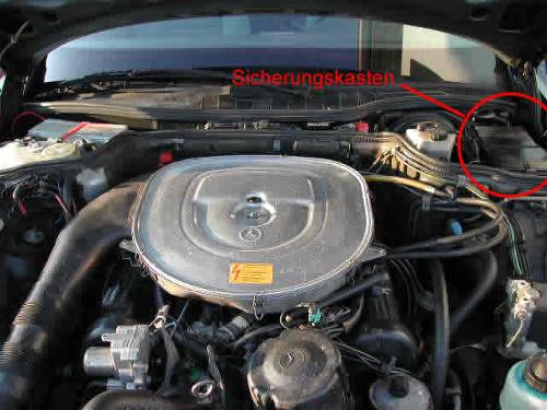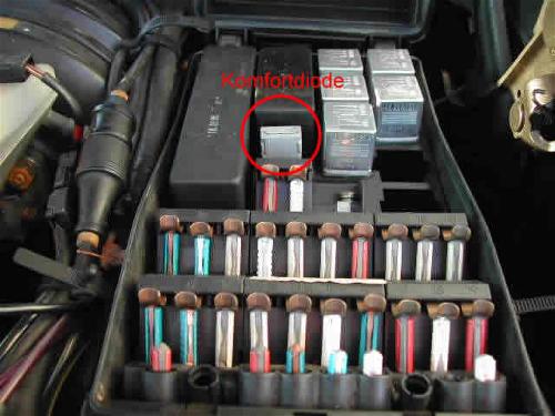 Das Radio schaltete sich mit Abschalten der Zündung aus. Beim öffnen der Tür schaltet es sich aber wieder ein bis die Tür geschlossen wird. Für diesen Fehler ist die defekte Komfortdiode verantwortlich. Die Komfortdiode ist im Motorraum Bild 01 im Sicherungskasten Bild 02 verbaut.