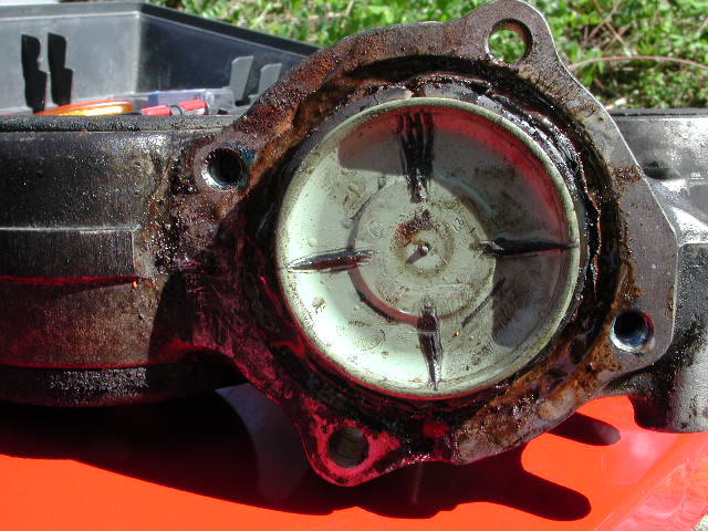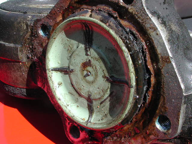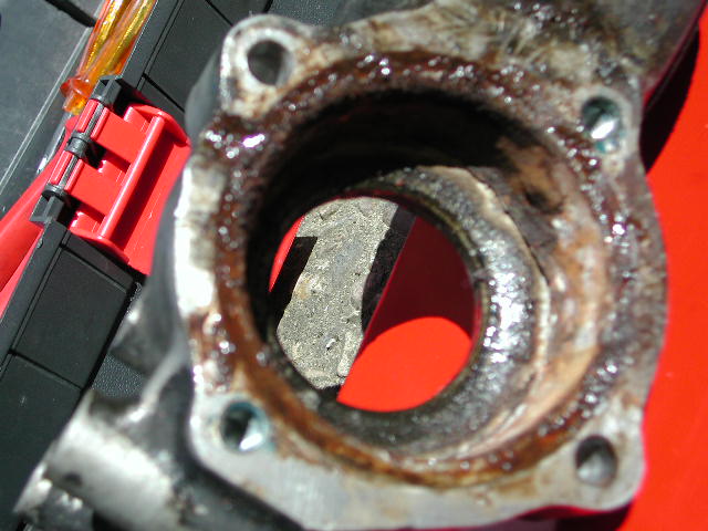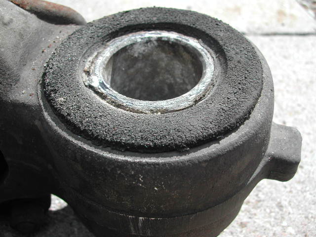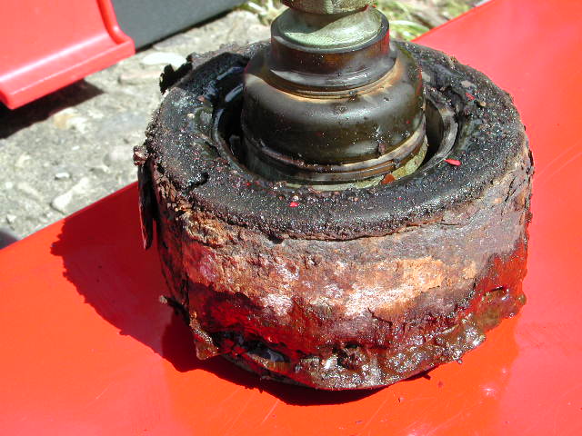 Im Bereich der Halteklipse sammelt sich soviel Dreck, der beim rausschrauben im Gewinde der Schraube sitzt und die Geschichte sehr schwergängig macht. Jetzt bin ich schlauer. Wer kann sollte diesen Bereich vor der Demontage mit Druckluft oder so gründlich reinigen. Jetzt noch das Stützgelenk aus dem Stützrohr geschraubt und ich hatte den Lagerträger in der Hand. Nach Demontage des Lagerdeckels kam das total vergammelte Stützgelenk zum vorschein.