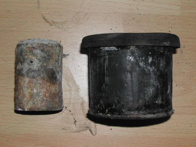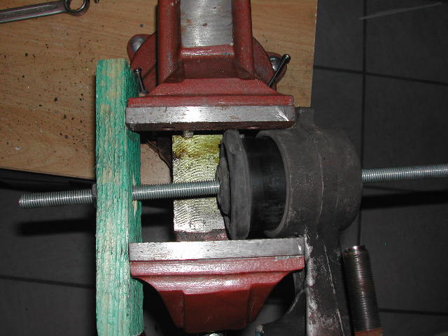 Diese Gummilager sitzen so fest, dass sie nicht ausgeschlagen werden können. Ich habe mir im Schraubstock einen Auszieher gebaut. Die Lager saßen so fest, dass beim ausziehen zuerst die Alubuchse aus dem Gummi ausgerisen ist. Im zweiten Durchgang konnte ich dann das restlich Gummilager ausziehen.