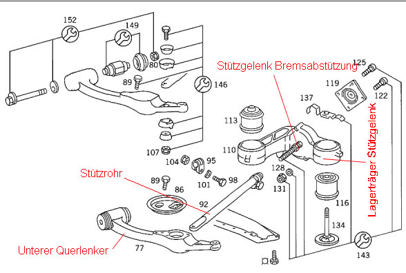 Wenn der Lagerträger eh schon ausgebaut ist, sollten auch gleich die beiden Gummilager (113+116) ausgetauscht werden.