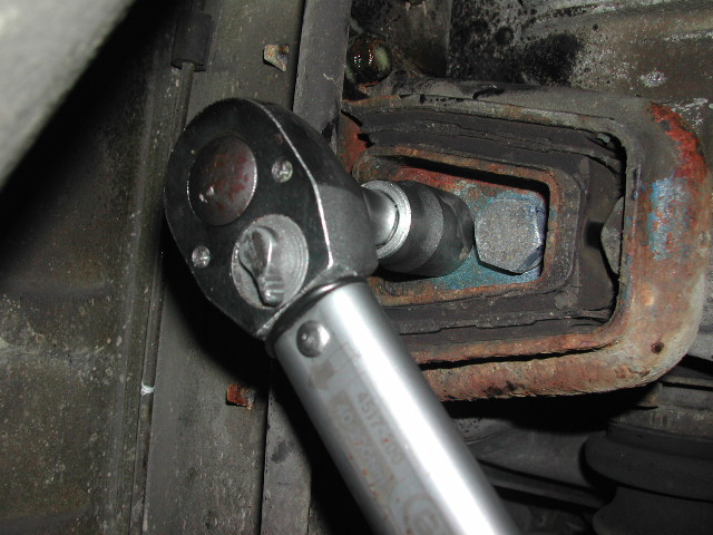 Nun das neue Gummilager am Hinterachsmittelstück anschrauben (120 Nm), Hinterachsmittelstück anheben und Gumminlager mit vier Schrauben (35 Nm) am Fahrzeugboden anschrauben. Fertig.