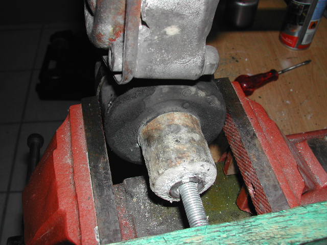 Diese Gummilager sitzen so fest, dass sie nicht ausgeschlagen werden können. Ich habe mir im Schraubstock einen Auszieher gebaut. Die Lager saßen so fest, dass beim ausziehen zuerst die Alubuchse aus dem Gummi ausgerisen ist. Im zweiten Durchgang konnte ich dann das restlich Gummilager ausziehen.